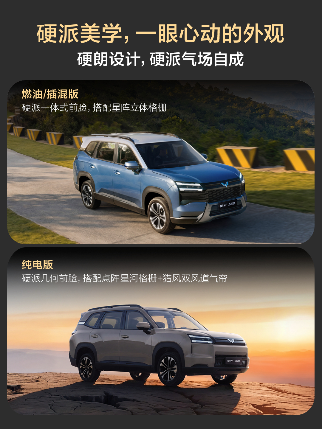 作为五菱品牌深耕家用出行市场的又一标杆力作,星光560承载着五菱“人民需要什么,我们就造什么”的品牌初心,更是品牌在SUV赛道的全新突破。依托五菱新能源销量超百万辆的深厚积淀以及星光家族爆款基因加持,星光560精准直击用户全场景出行痛点。它不仅是6万级唯一集齐燃油、插混、纯电三动力的SUV,更以自身多项优势,重新定义了经济型SUV的价值标杆,真正打造出一款属于新时代人民的全能硬派大空间SUV!