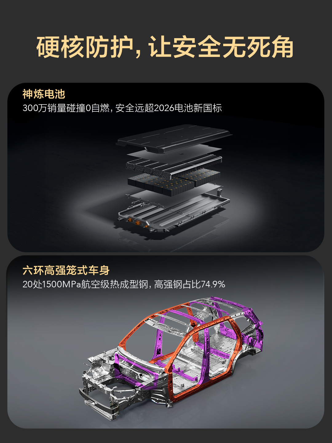 安全方面,星光560宣称采用“军工级”标准打造。车身结构采用六环高强钢笼式设计,高强度钢占比达到74.9%,关键受力部位使用了抗拉强度达1500MPa的热成型钢,构筑“钢筋铁骨”式守护。