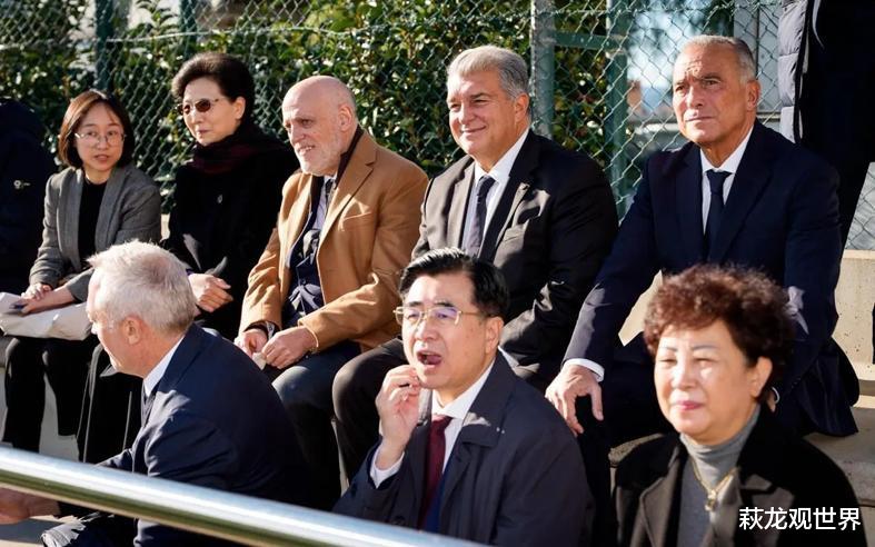 巴塞罗那俱乐部主席拉波尔塔与西甲联盟主席特巴斯,共同欢迎由中国国务委员谌贻琴率领的中国代表团访问巴萨拉玛西亚青训营。