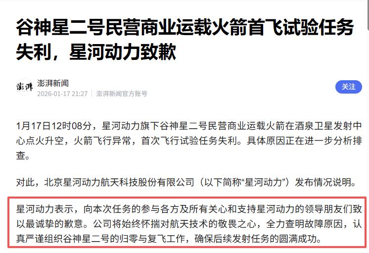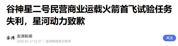 澎湃新闻 2026-01-17——谷神星二号民营商业运载火箭首飞试验任务失利,星河动力致歉