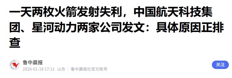 鲁中晨报 2026-01-18——一天两枚火箭发射失利,中国航天科技集团、星河动力两家公司发文:具体原因正排查