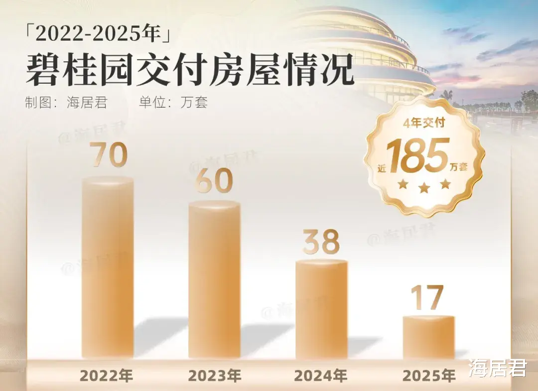 数据显示,2022年至2025年,碧桂园交付房屋数量分别高达70万套、60万套、38万套及17万套,累计完成房屋交付近185万套,领先行业。