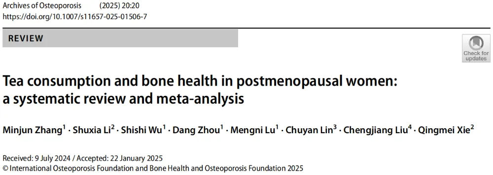 [3]ZHANG M, LI S, WU S, et al. Tea consumption and bone health in postmenopausal women: a systematic review and meta-analysis[J]. Arch Osteoporos, 2025 Feb 5; 20(1): 20. DOI: 10.1007/s11657-025-01506-7.