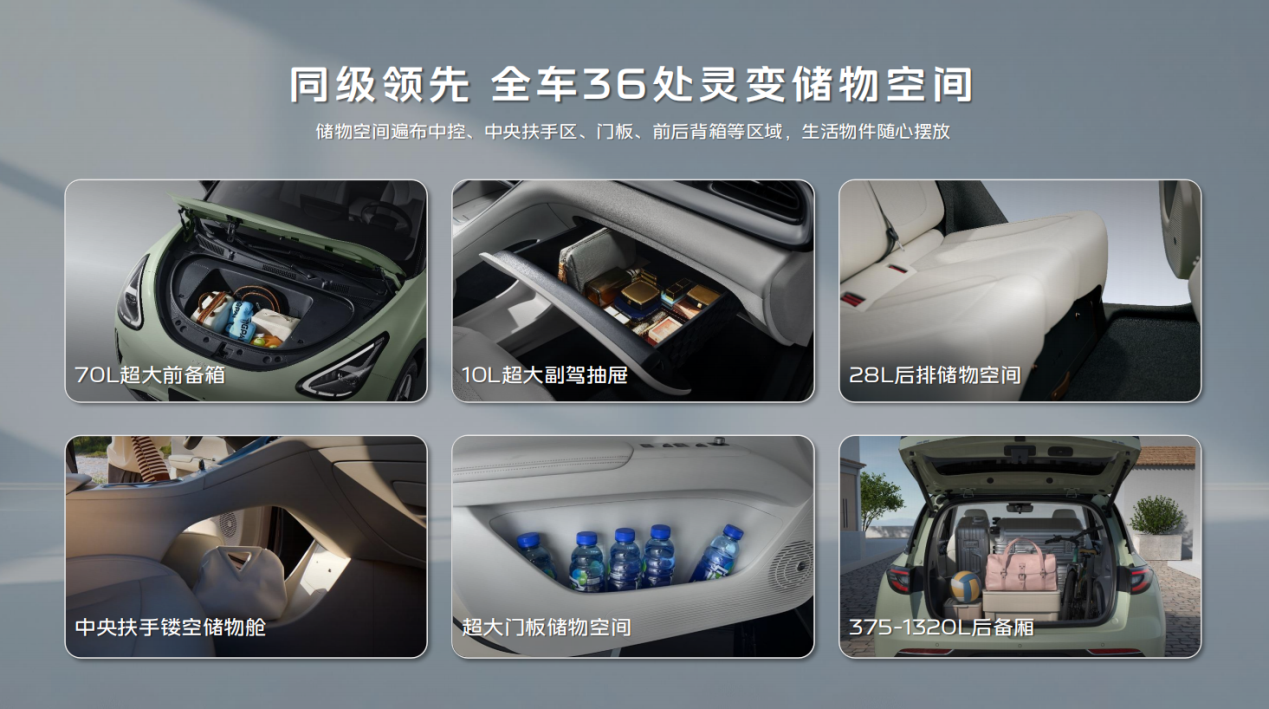 空间设计是2026款星愿的核心竞争力之一。车辆基于GEA新能源架构打造,长宽高分别为4135mm、1805mm和1570mm,轴距达到2650mm,这一尺寸与比亚迪海豚相当,确保了日常驾驶的便捷性。更值得一提的是,车辆实现了85%的高得房率,通过优化布局,提供了35处灵变储物空间,包括同级少有的70L前备厢(支持远程开启)、10L副驾储物盒和20L中央扶手储物空间。后备厢容积可在375L至1320L之间扩展,后排座椅支持按比例放倒,无论是日常通勤还是家庭出行,都能轻松应对。此外,后排纯平地板面积达0.61平方米,横向空间为1452mm,配合42mm超低门槛和65°大开门角度,营造出准B级车的乘坐体验和上下车便利性。