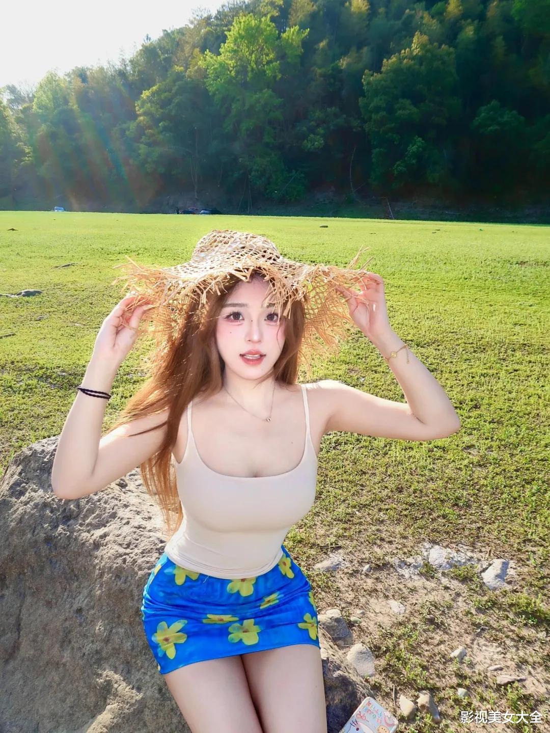 户外有石头的话,坐靠在石头上拍碎花短裙照很合适,后背轻轻靠着石头,不用坐得太直,放松就好,然后双手扶着帽子,不管是遮阳帽还是草帽,都能让姿势更自然,最后看着镜头笑一笑,不用笑得太大声,浅浅的微笑就很有感染力,这样拍出来简单又出片。