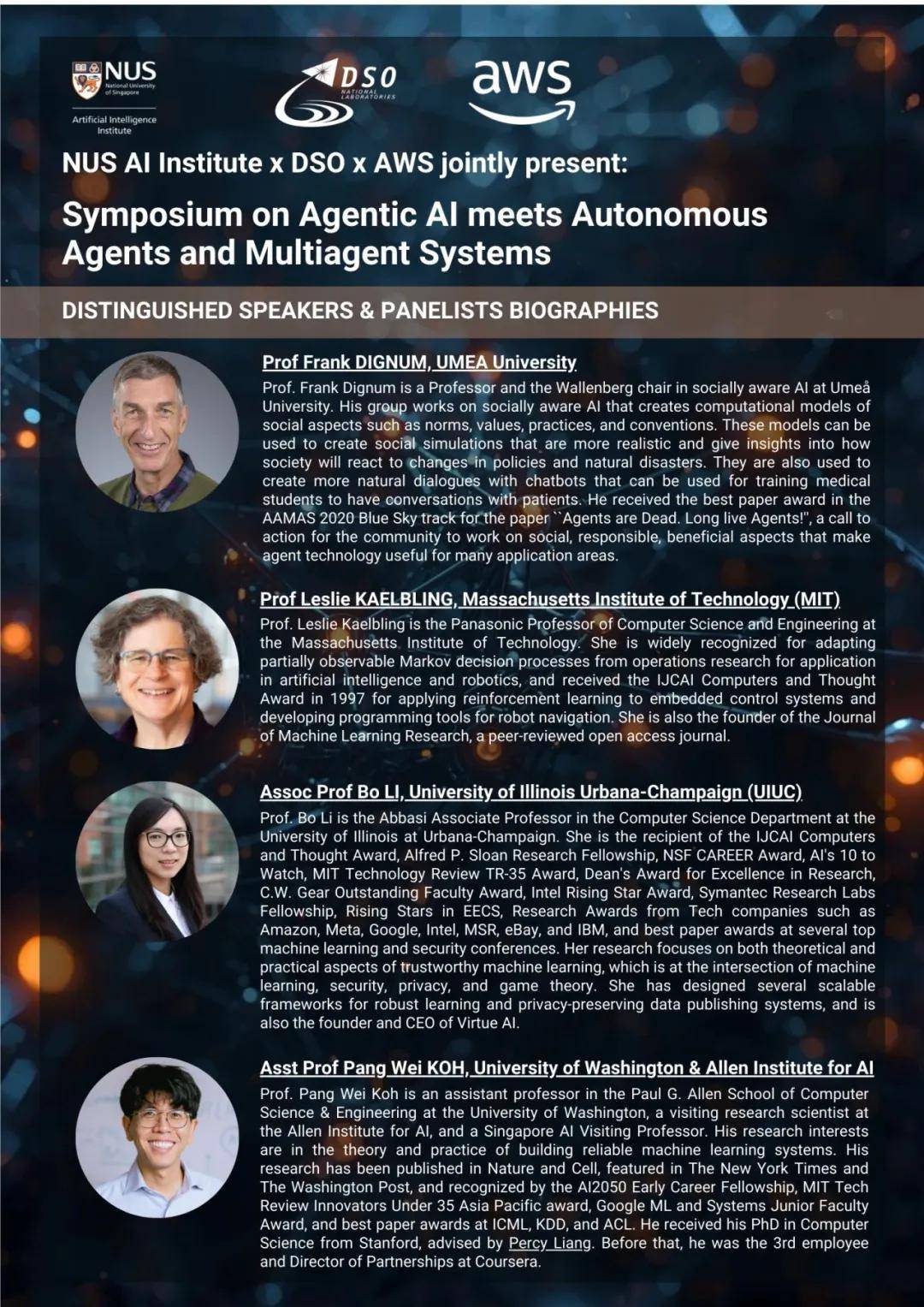 Leslie Kaelbling (麻省理工学院 MIT) Bo Li (伊利诺伊大学香槟分校 UIUC) Pang Wei Koh (华盛顿大学Ai2) Frank Dignum (瑞典于默奥大学)