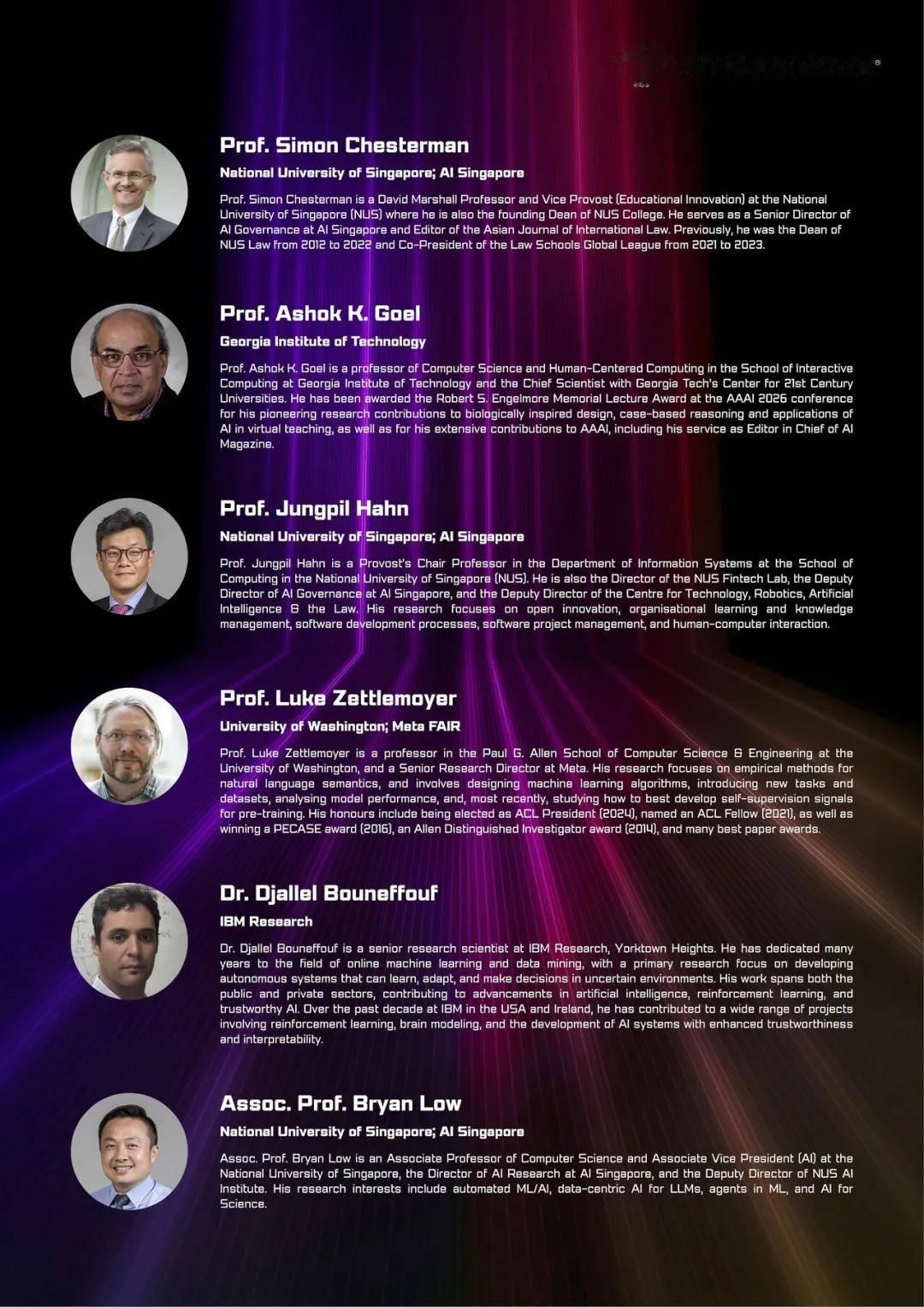 本次研讨会邀请了多位重量级嘉宾,包括 Ashok Goel (佐治亚理工学院)、Jungpil Hahn (新加坡国立大学计算机学院)、Luke Zettlemoyer (华盛顿大学Meta FAIR) 以及 Djallel Bouneffouf (IBM 研究院)。
