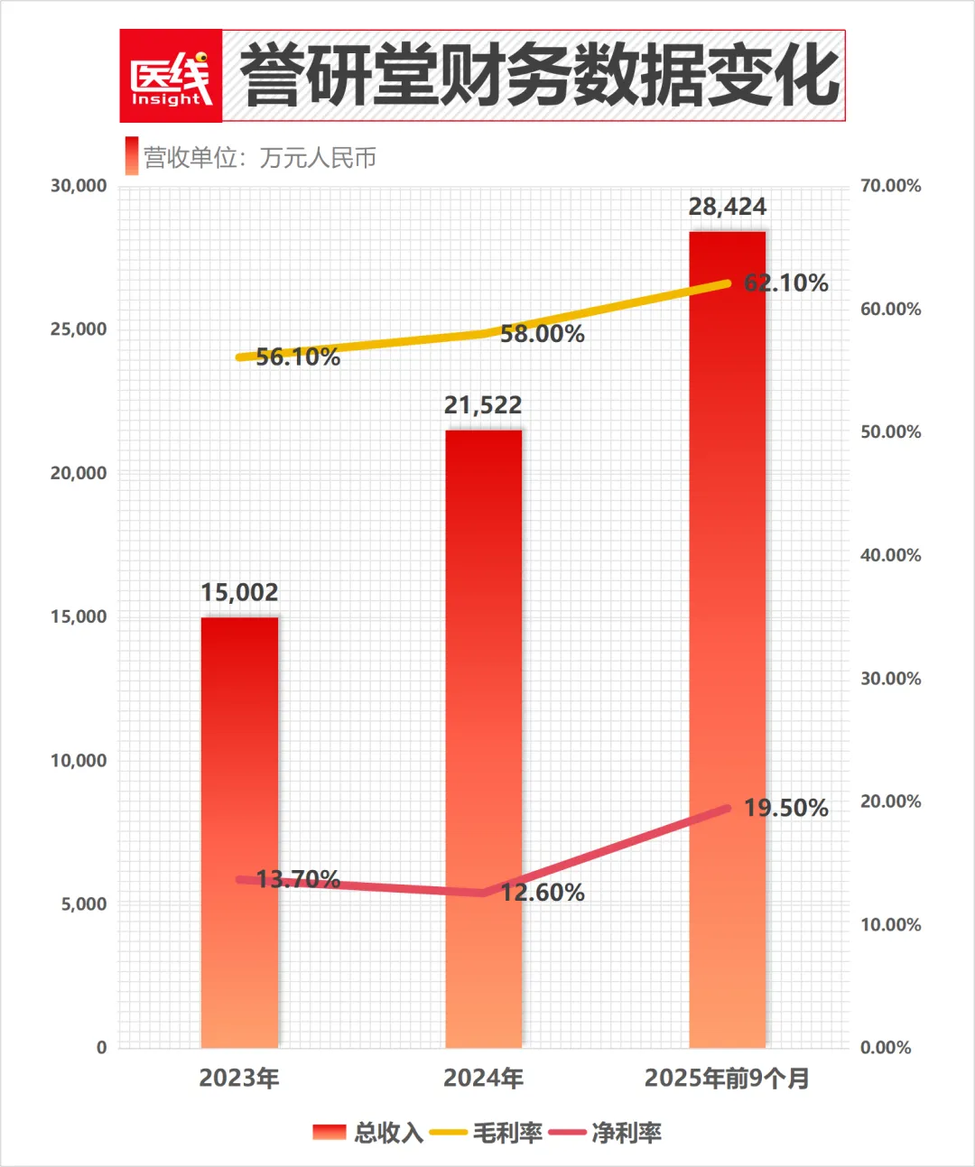 招股书显示,仅2025年前9个月,誉研堂的营收就已逼近3亿元大关,毛利率更是飙升至62.1%——这一数字,甚至超越了许多医美机构。