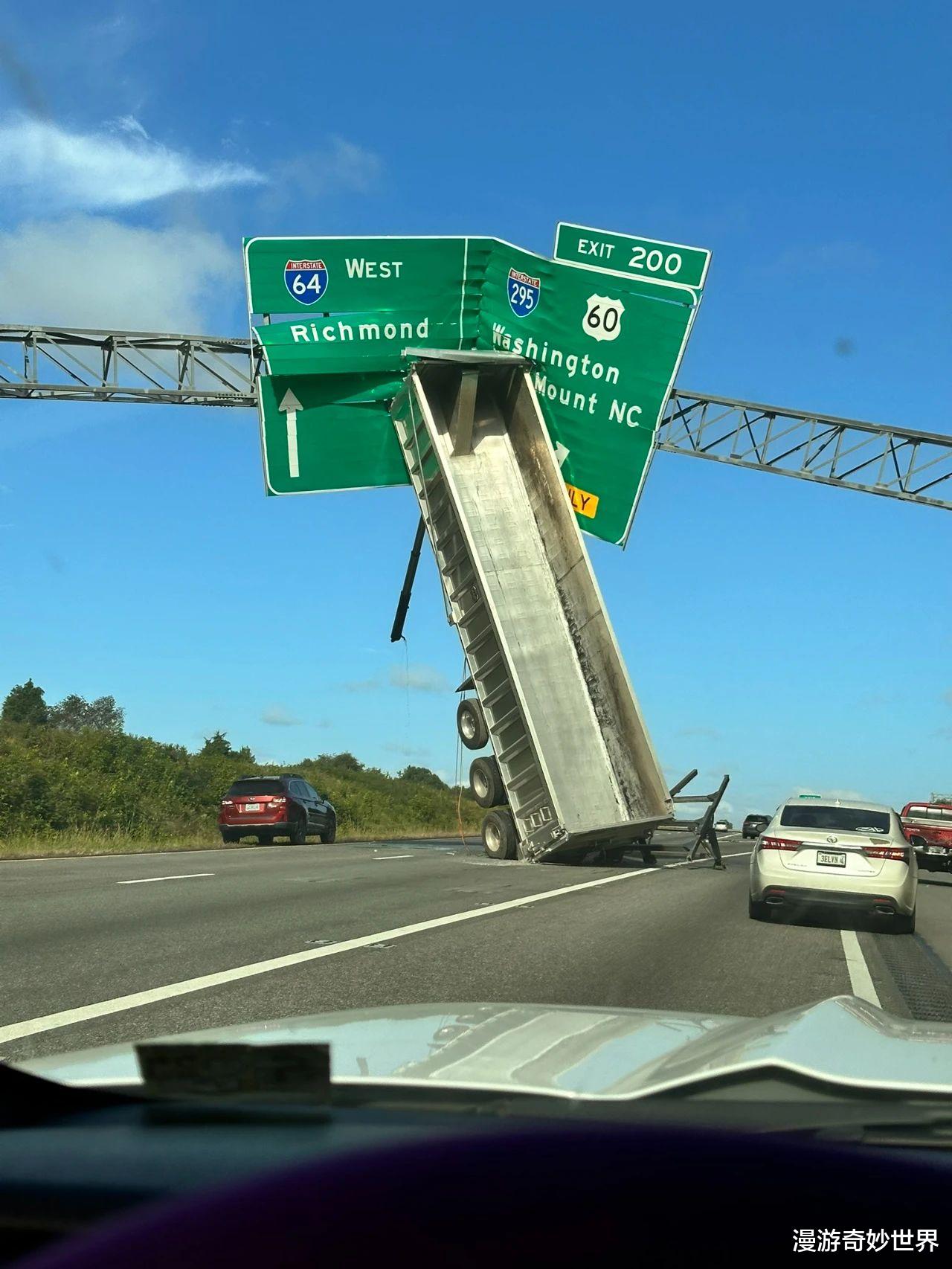 真的很惨……但我还是想问一句:这到底是怎么做到的?难道是卸完货后,忘记把车斗子降下来???