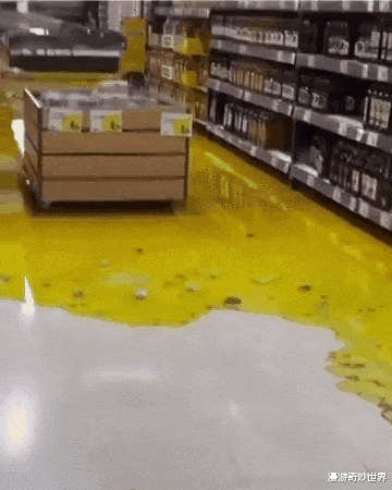 货架倒塌,整个超市都被油给淹没了…快!快把猫砂架推倒!还有洗洁精架!