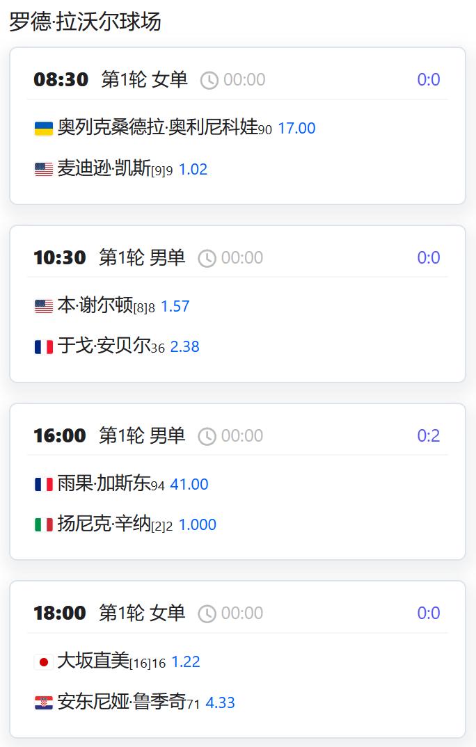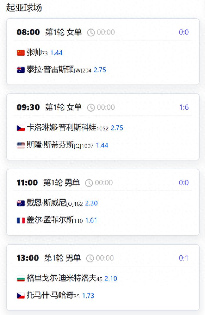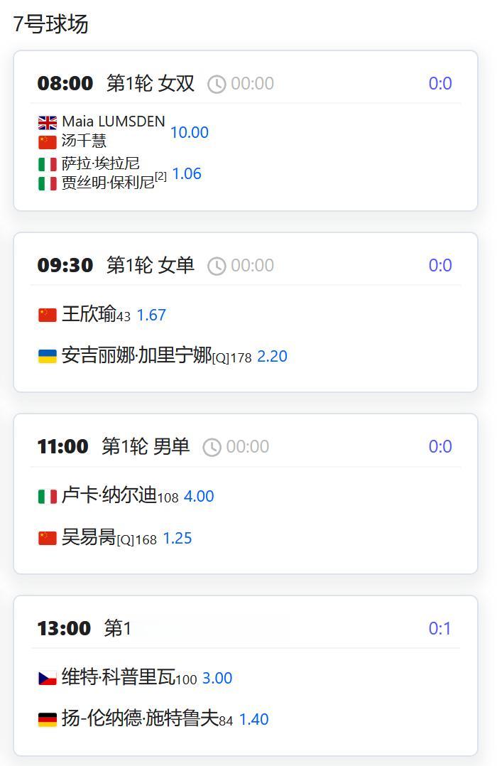 中国球员方面,还未出战的张帅、王欣瑜和吴易昺都将登场,另外女双第一轮的部分比赛也将开始,汤千慧搭档英国的卢姆斯登出战。