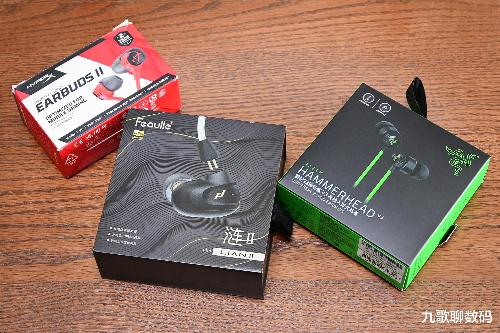 三款耳塞里,云雀2、涟2分别为百元档和两百元档的价格,而战锤狂鲨V3的售价则是在三百元价位段,这三款产品在设计语言、材质质感、佩戴表现、综合素质上都有着明显差异。仅从包装上即可看出各家特色。极度未知HyperX和雷蛇都是电竞外设老品牌了。云雀2和战锤狂鲨V3亦都是入门级的热销款,侧重点都在游戏的沉浸式体验上。而绯乐作为国产新势力,左上角的小金标很醒目,不止于游戏,对HIFI也有突出。