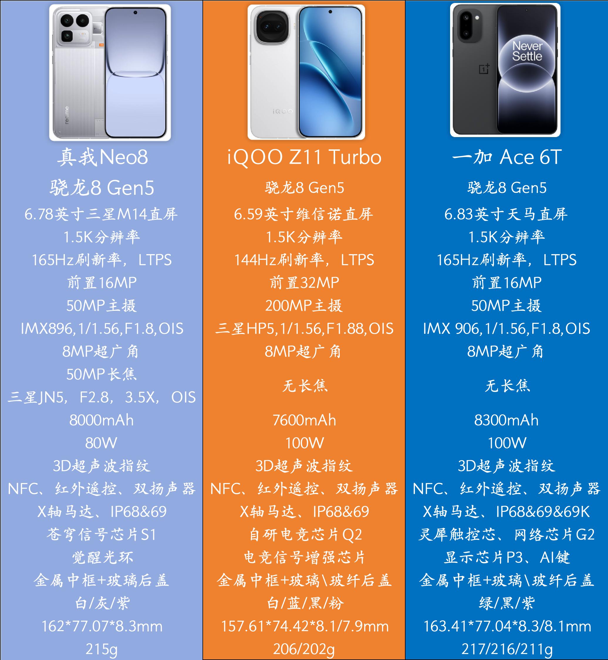 按照惯例,先把真我Neo8、iQOO Z11 Turbo和一加Ace 6T这三款骁龙8 Gen5性能机的配置信息给列出来,方便大家自行对比。