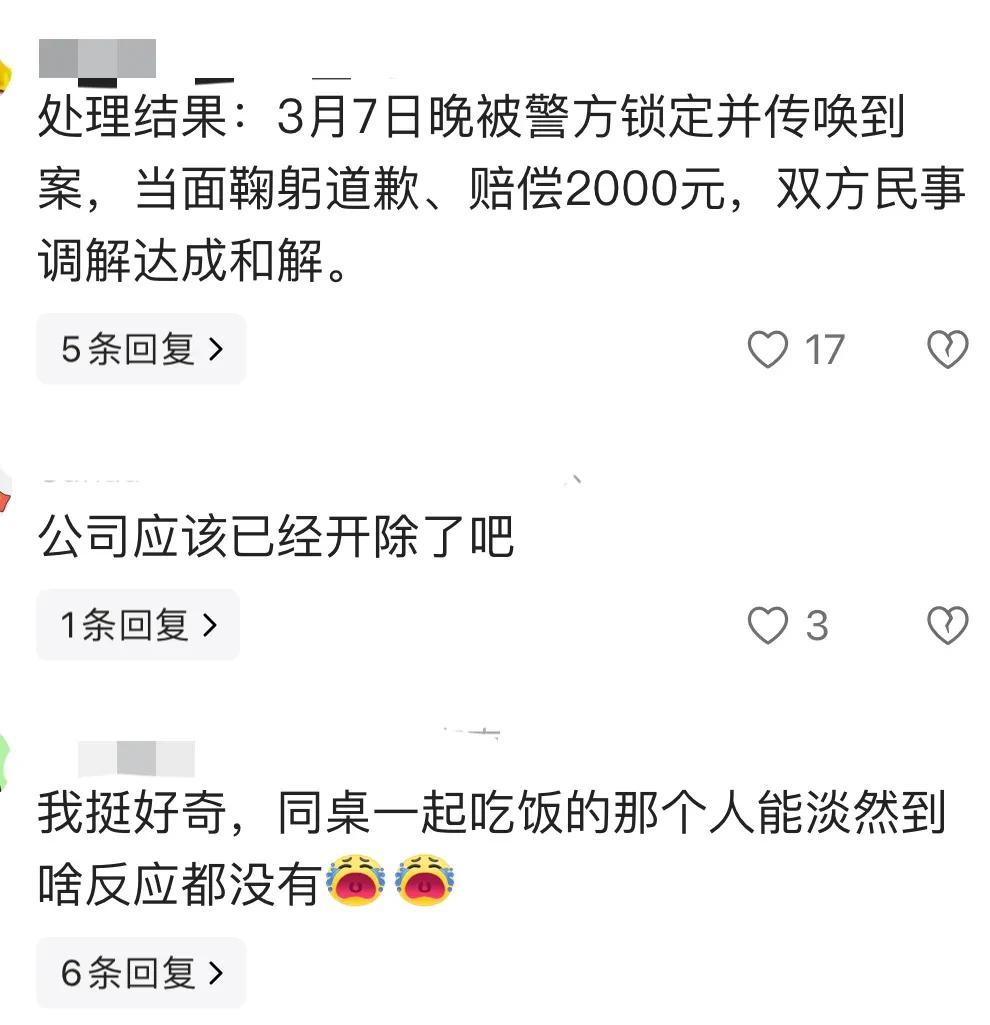 令人气愤的是,黑衣女子做完这一切,仿佛若无其事一样,继续和闺蜜吃饭聊天,就好像“大仇得报”的样子。