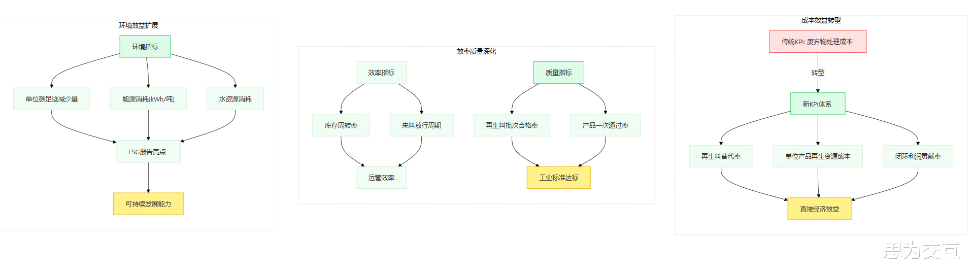 从成本到效益的转变:传统KPI关注的是废弃物处理成本,而新的KPI则聚焦于再生料替代率、单位产品再生资源使用成本以及闭环利润贡献率。这些指标直接反映了再生资源作为“资产”为企业带来的直接经济效益。