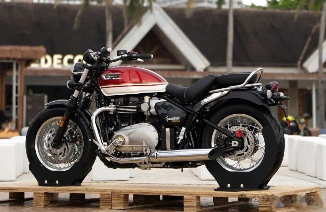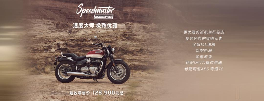 BONNEVILLE 速度大师,售价128900元,不变。凯旋唯一双缸巡航车,架构和调教与BOBBER一致。配色曜石黑/水晶白,嘉年华红/水晶白。全新14L油箱,铝制轮圈,加厚座垫,标配IMU六轴传感器,标配弯道ABS,弯道TC。