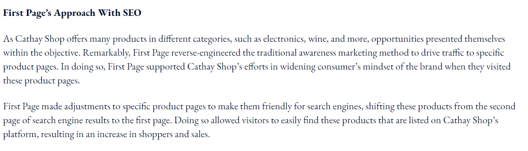 这里可以看一个虽然不是独立站、但逻辑完全通用的案例:国泰航空旗下的购物平台Cathay Shop。他们想从单纯的机票服务转型为生活方式电商,卖红酒、卖电子产品。如果是你,你会怎么推?他们没硬砸广告,而是通过“逆向思维”做SEO。