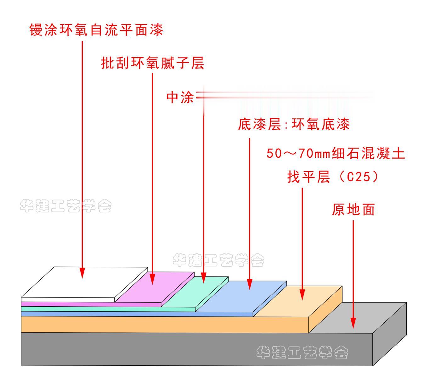 环氧树脂自流平地面的施工是一个环环相扣的多层涂装系统,包括底涂层、中涂层和面涂层。