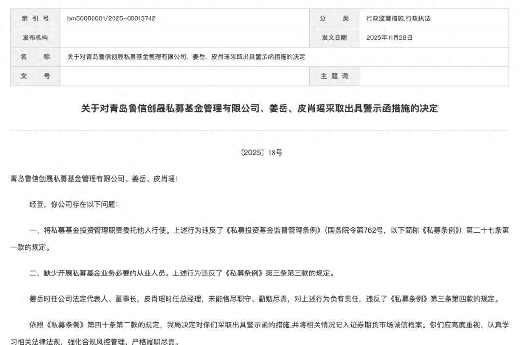 因为违反《私募投资基金监督管理条例》,近期青岛鲁信创晟私募基金管理有限公司(下称“鲁信创晟”)以及时任董事长姜岳、时任总经理皮肖瑶被青岛证监局出具警示函。