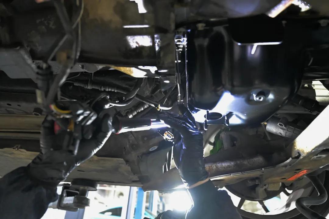 安装完成后依次装回机油量传感器、机脚垫、元宝梁。降下举升机开始更换机滤底座垫。结果又是一重惊喜——机滤底座滑牙,需要重新攻丝。