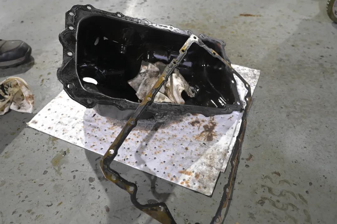 拧下油底壳螺丝,发现拆卸垫片需要用工具撬开,也是因为被打了胶。