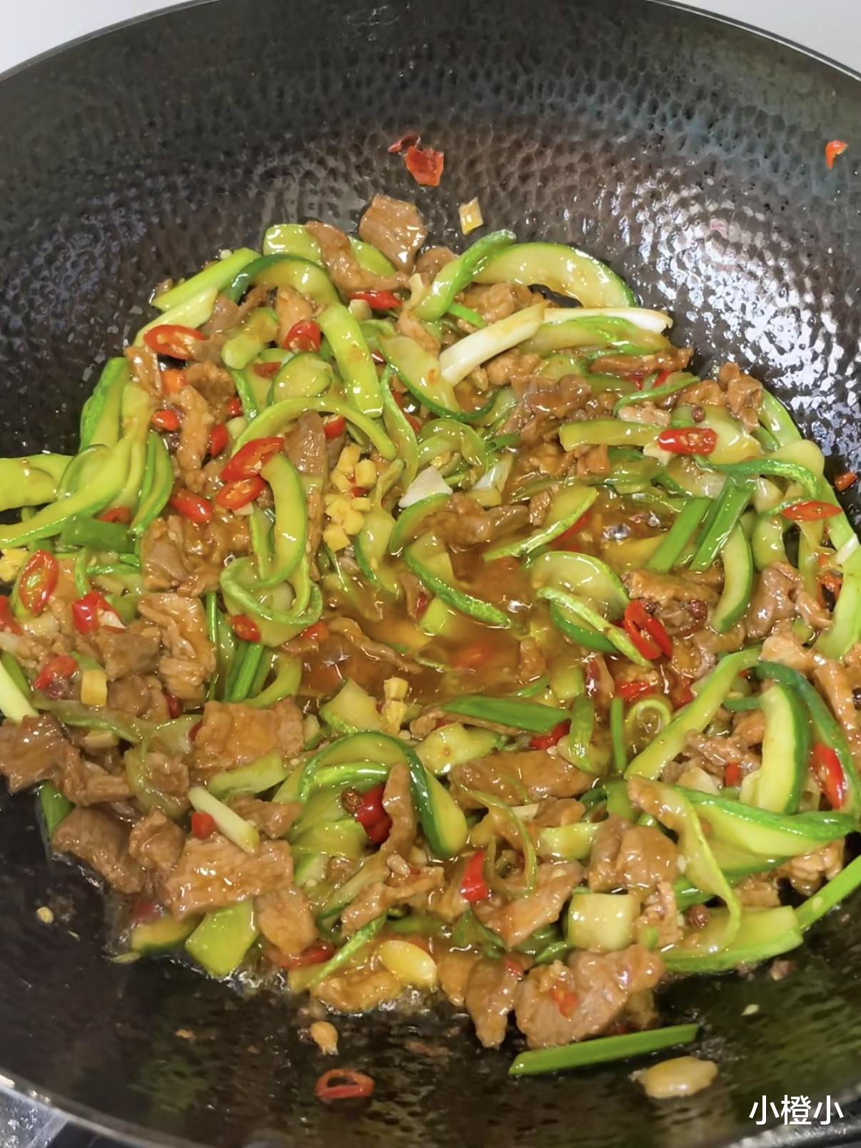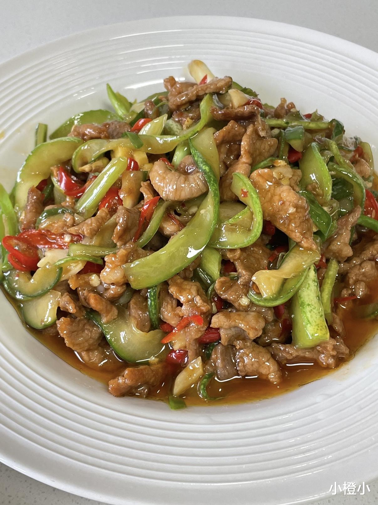 Step3:肉片回锅,倒入调好的酱汁,锅边淋2勺热水(滋啦一声,瞬间起锅气!),撒葱段,颠锅5秒出锅——全程不超过1分钟,黄瓜碧绿、肉片闪着油光,完美!