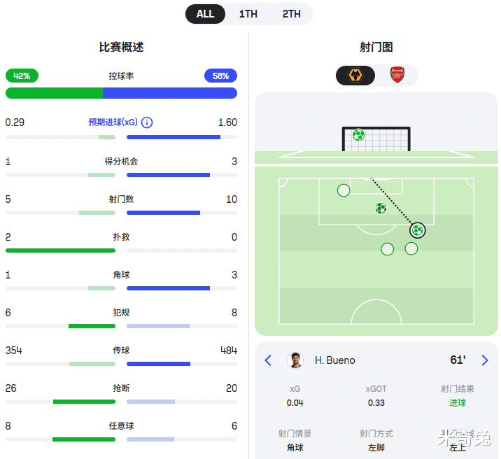 其实狼队全场比赛也仅有5次射门,第一脚射门更是出现在上半场的补时阶段。结果他们最后2脚射门都进球了,更不可思议的是,61分钟的那个进球,预期进球仅有0.04。