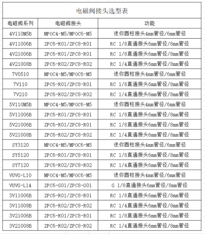 2、电磁阀出气接头:需根据电磁阀具体型号查阅相关手册进行选择。通常1个电磁阀需搭配2个出气接头(注:A09/A10型号为1个)。以下为常用搭配参考——