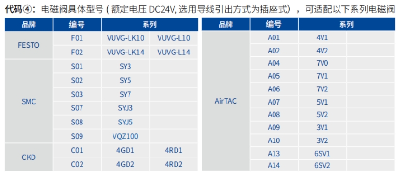 3、选择所需电磁阀型号。下图是目前阀岛适配的电磁阀品牌和系列,若您所需不在其中,请联系我们,我们将根据电磁阀尺寸、出线方式、接头位置等为您比对适配型号。
