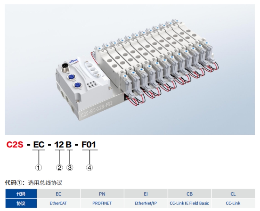 1、首先根据通讯接口确定使用C2S(M12接口)还是C2P(网口),随后选择所需的总线协议,如PN、EC、EI等,具体选项如下图所示:
