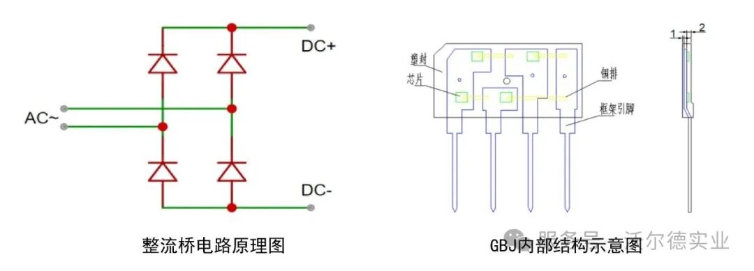 整流桥内部是由四个二极管构成的桥式电路,以实现将输入的交流电压转换成输出的直流电压。