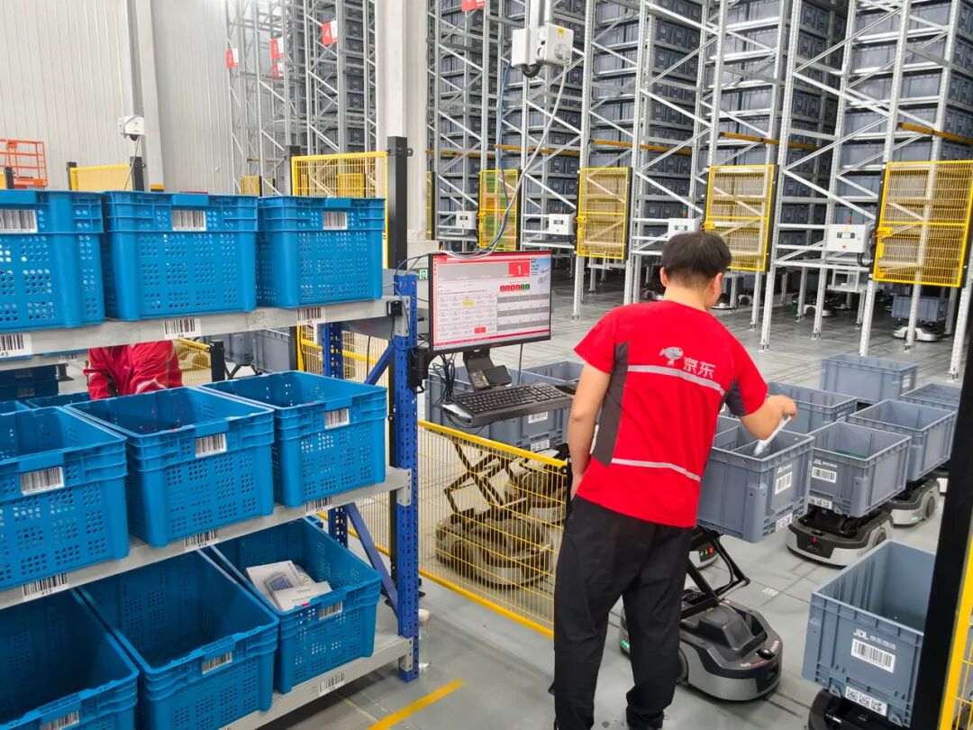 当商品到达仓库后,京东物流员工只需从周转箱取出商品,用PDA扫描商品码后直接放入料箱投线。其他工作,基本由智狼机器人完成,机器人可以通过智能采集技术,进行快速倒箱、自动入库,入库效率大幅提升5-6倍。