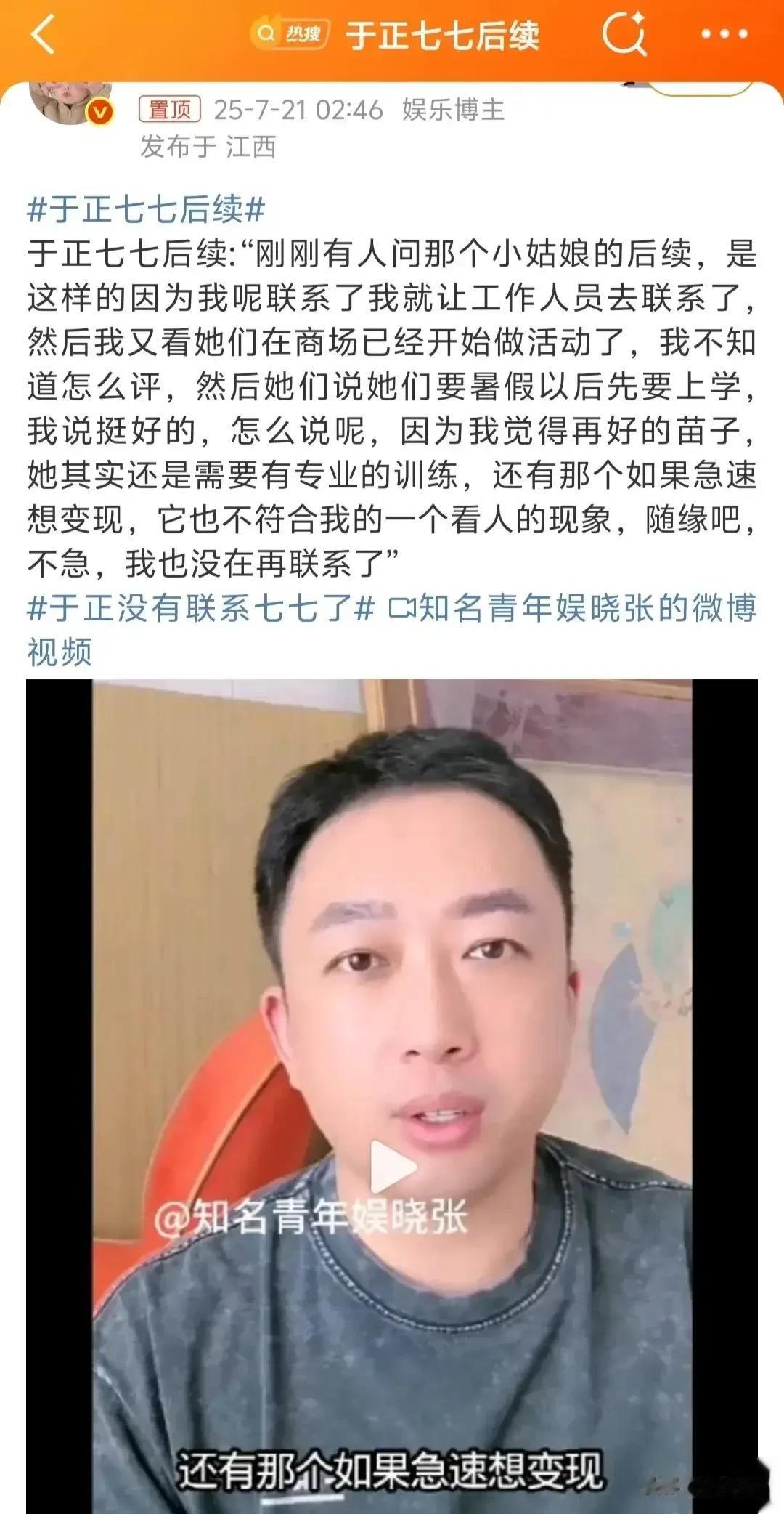 泼天富贵从天而降,就在大家以为七七已经半只脚踏入娱乐圈时,那边传来了七七家长婉拒于正的消息:于正想让七七当面去北京聊,这边以要上兴趣班没空为由拒绝。