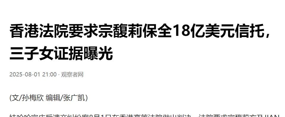 家里的财产纠纷比商场上还乱。宗庆后和杜建英生了三个孩子,两个儿子一个女儿。2024年8月,香港那边的法院冻结了一笔18亿美金的信托,这三个同父异母的弟弟妹妹说父亲答应给他们21亿美元。但宗庆后留了两份遗嘱,写得清清楚楚,海外财产归宗馥莉、她妈妈还有奶奶,根本没提那三个孩子。可他们争的信托资产却不在遗嘱范围内。这事儿,到现在还在闹,短期内恐怕很难有结果。