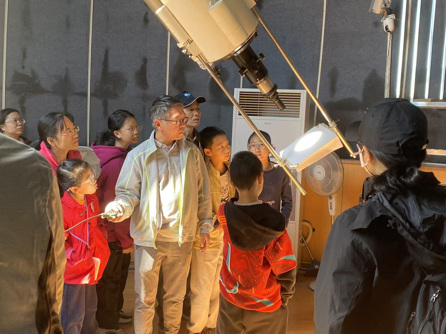 作为活动的“重磅环节”,天文台参观让孩子们的探索热情达到顶峰。此前的望远镜主题讲座,早已让大家对这个“看星星的地方”充满期待。当3、4米高的天文望远镜出现在眼前时,孩子们忍不住发出阵阵惊叹。工作人员详细介绍了这台望远镜的结构——从巨大的镜筒到精密的操控系统,每一个部件的功能都讲解得清晰透彻。工作人员还现场演示了望远镜的调试过程,讲解了如何通过它捕捉行星、星系的踪迹,让孩子们直观感受到天文观测的严谨与神奇,也对奇妙的天文世界有了更深刻的体会。