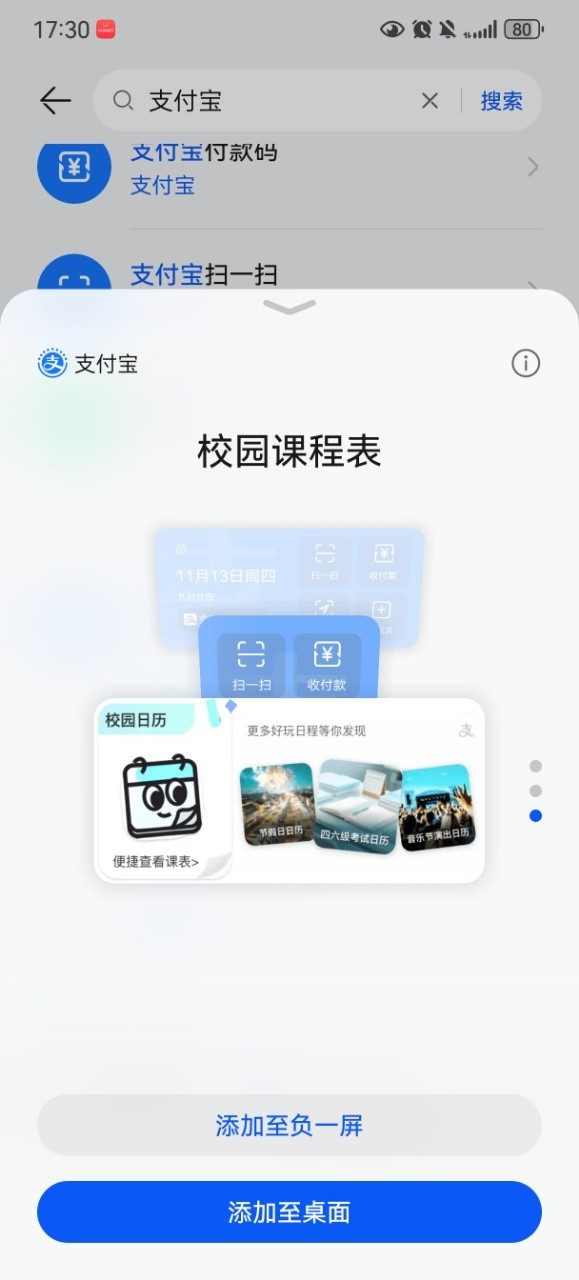 第一个方法是在手机桌面右滑进入负一屏后,直接点击顶部的搜索框。输入“支付宝/学生课表/学生课表添加”依次点击这几个关键词,等出现校园课程表卡片的时候,点击“添加至负一屏”就Ok了。