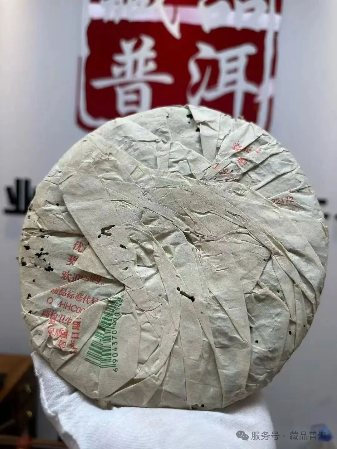 规格:375克/饼。辨识点:棉纸较厚实,包法为螺旋包,背面印制了详细的茶品信息,明确标注净含量375g;商品标准代号上,第二个字母B被涂改液遮掉,正是这批茶的独特标识。