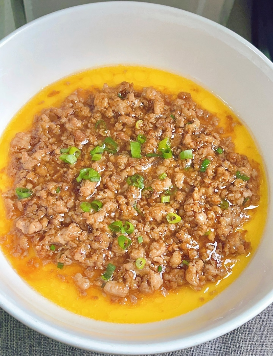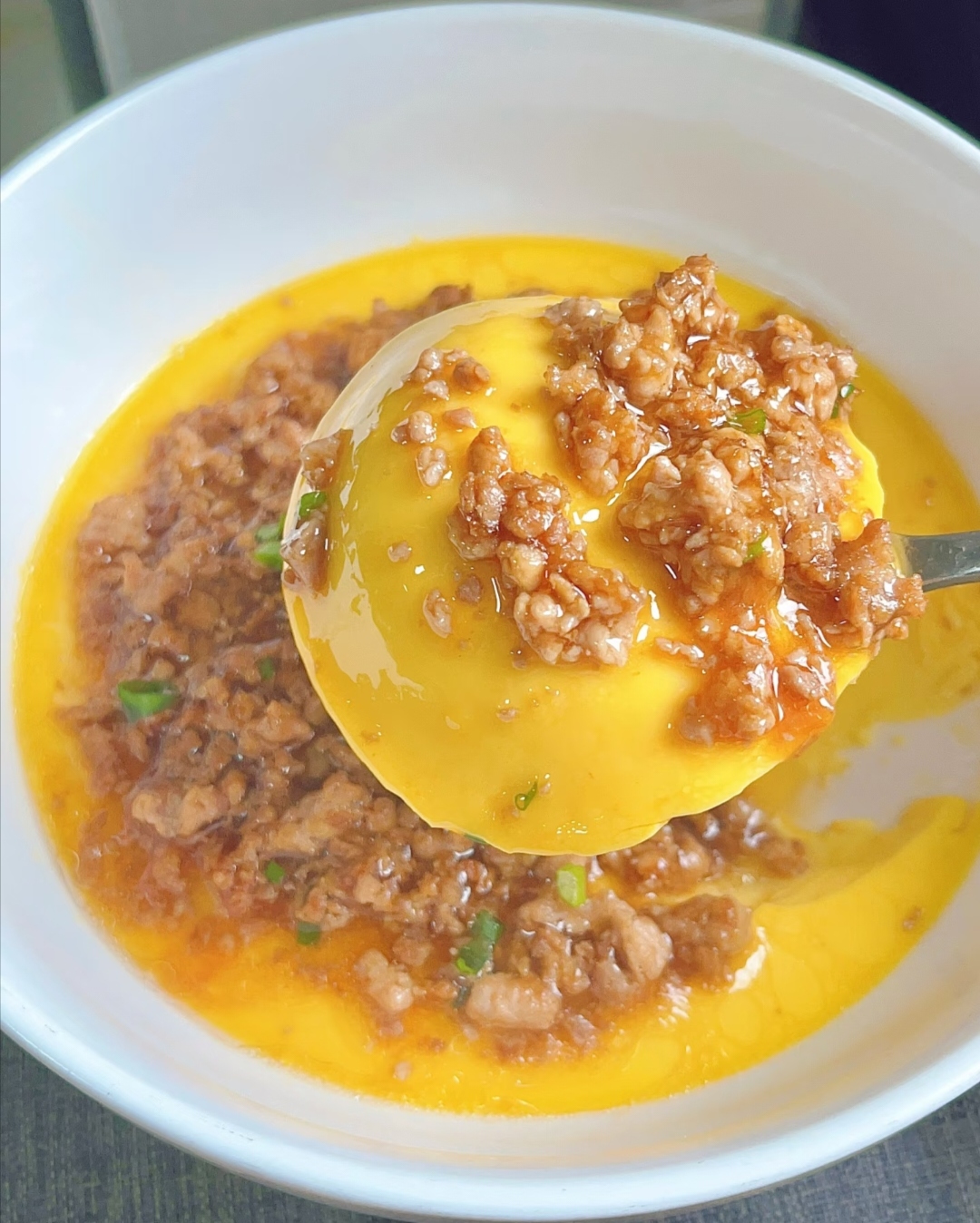把肉末连酱汁一起铺在蛋羹上,“滋啦”一声,酱汁顺着蛋缝往下渗,画面太诱人了!最后撒葱花,开吃!