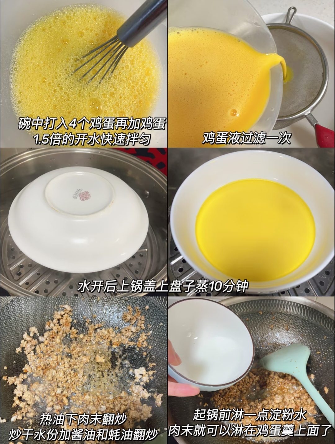 1. 芝士版:肉末炒好后撒一把马苏里拉,再盖蛋羹蒸3分钟,拉丝效果让小朋友尖叫。