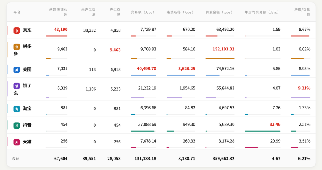 这也解释了为什么美团的罚没总额(7.46亿)高于问题店铺数量更多的京东(6.35亿)。