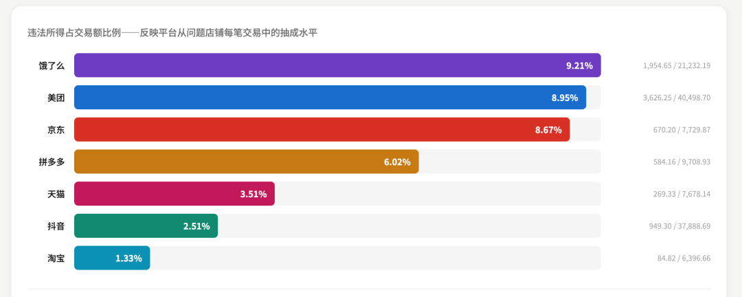 我们可以用违法所得除以交易额得到各家平台大致的抽佣比例。
