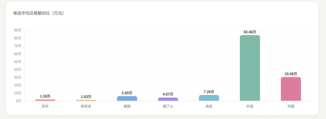 3. 抖音单店交易额最高按照交易额除以产生交易额的店铺数量,抖音的单店销售额超过83万,远超其他几家平台。