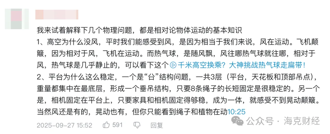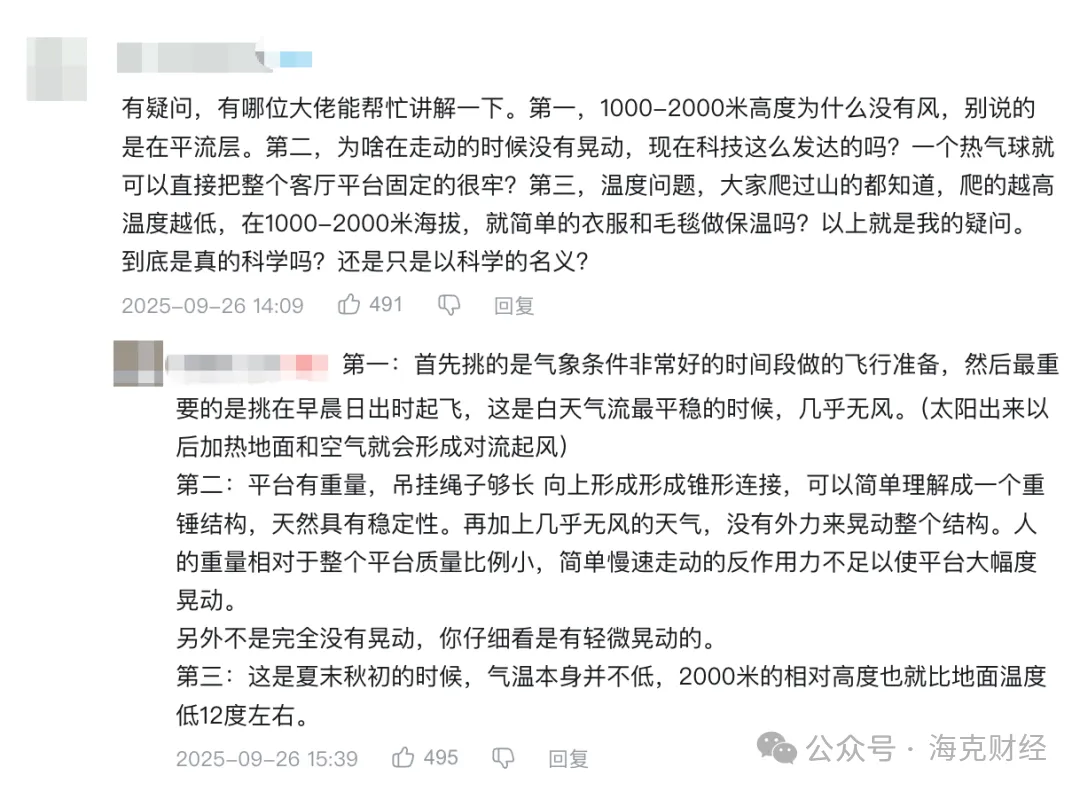 有用户从相对论的角度,讨探讨高空悬浮客厅的可行性;也有观众结合气象学知识,分析温压条件对设备运行的影响。