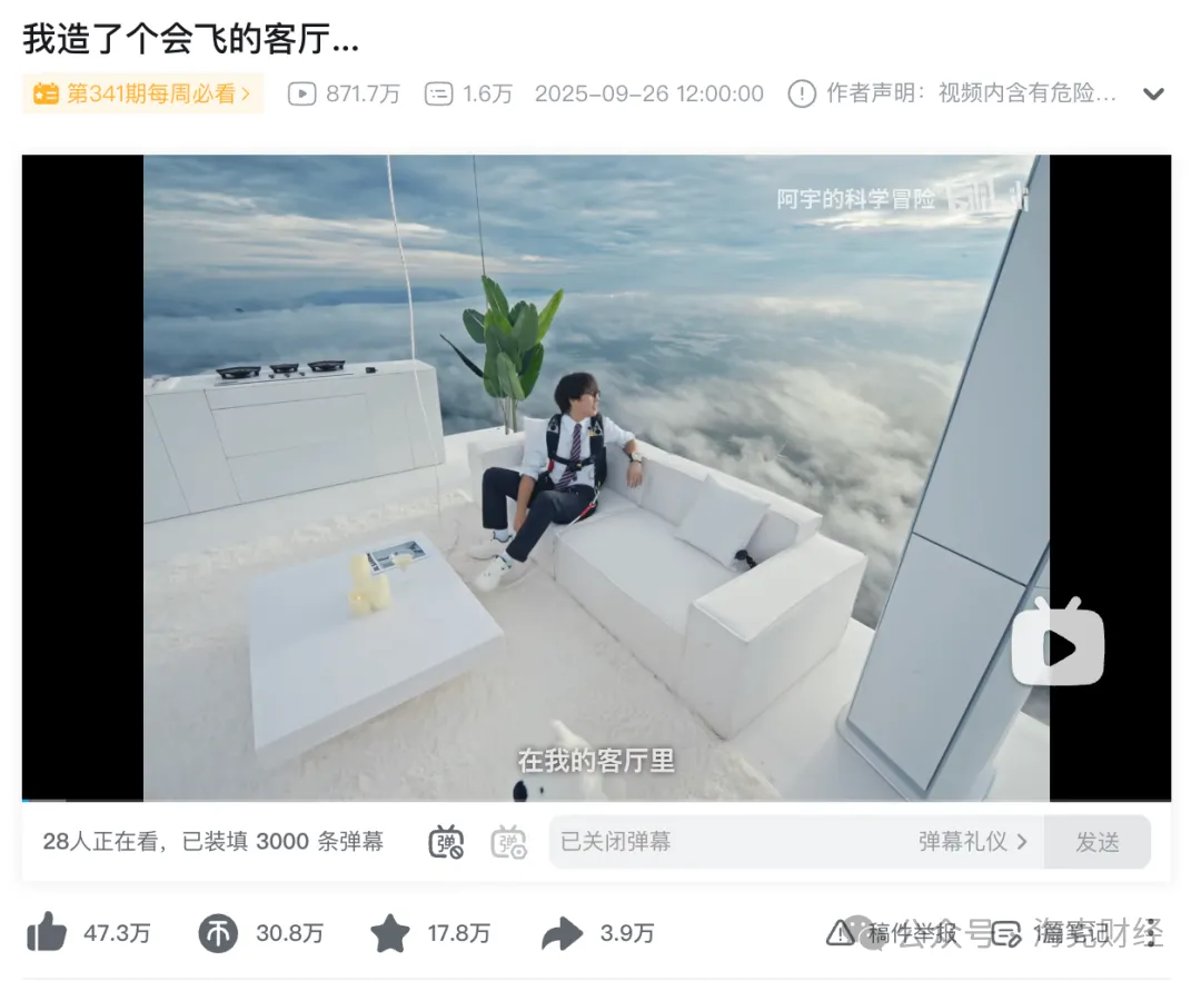 比如视频《我造了个会飞的客厅...》,这是他与家电品牌COLMO的合作。为了体现品牌的“云璃白”配色和产品性能,他将客厅搬到2000米高空,在云层中沉浸式体验产品。