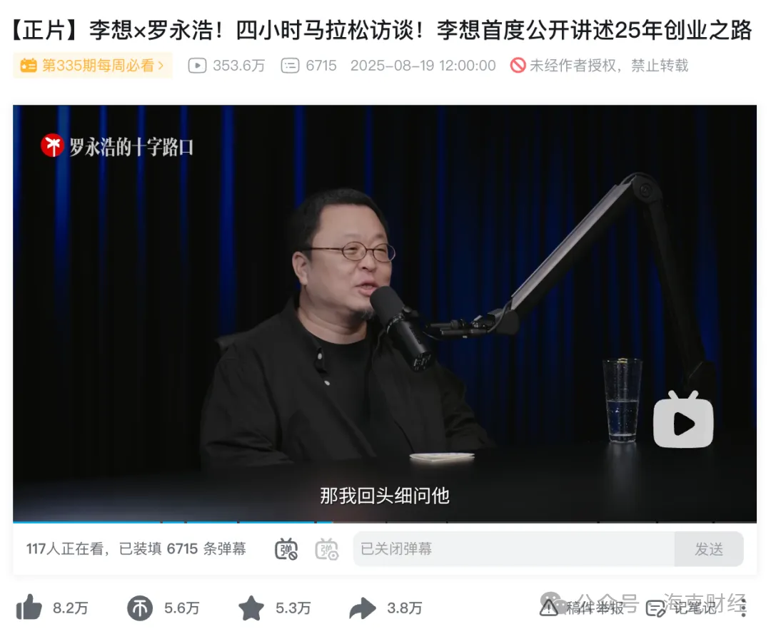 在罗永浩对谈李想的四小时视频播客中,有不少用户分享对于理想汽车品牌与视频播客内容的探讨。