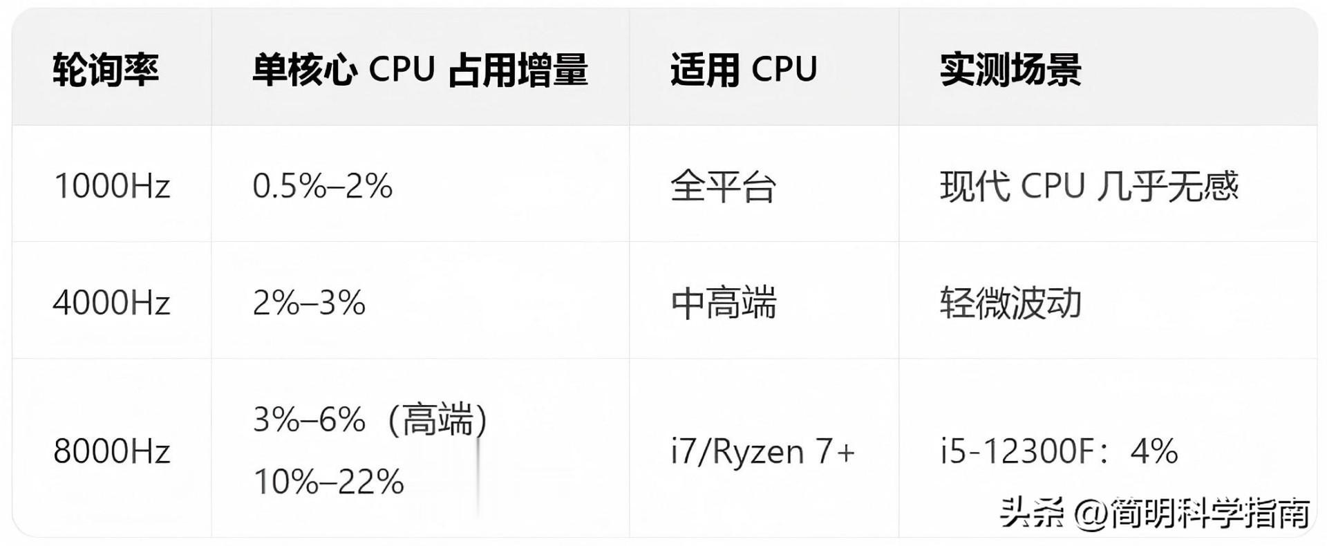 反观高端处理器,因为单核性能强劲,这点额外开销基本无感;但对于主流配置来说,8000Hz带来的理论延迟优势,未必抵得上它吃掉的性能。