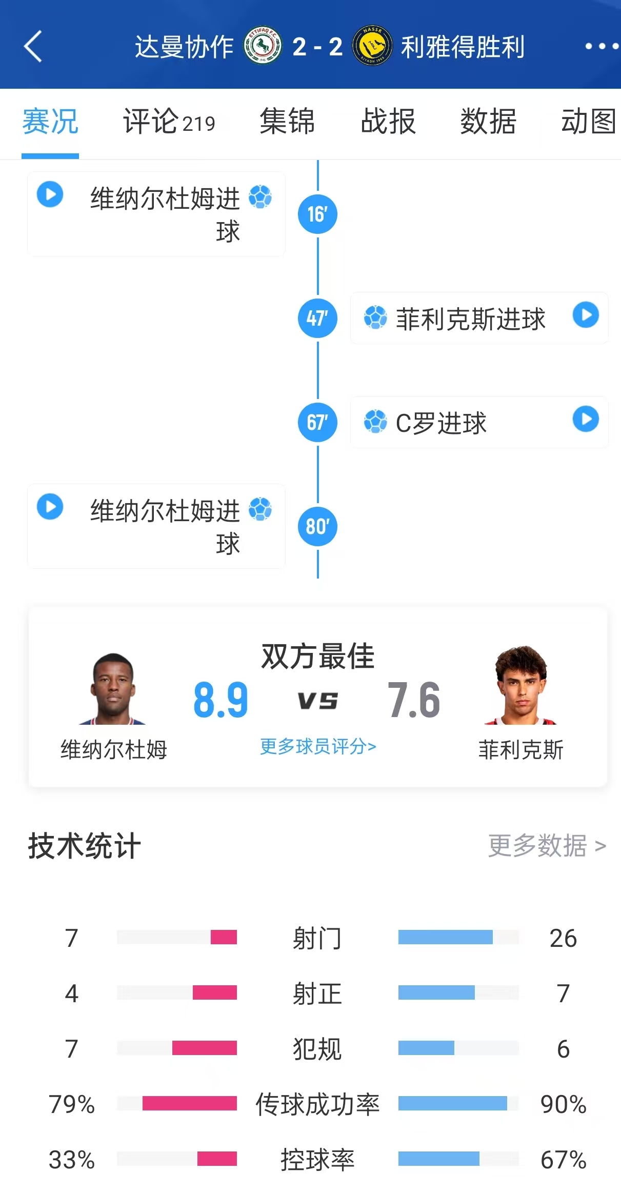 12月31日凌晨1点30分 沙特联第12轮,达曼协作2-2利雅得胜利的比赛中,第67分钟,菲利克斯抽射,皮球击中C罗背部折射破门,利雅得胜利2-1反超!C罗跑到场边siu庆祝!