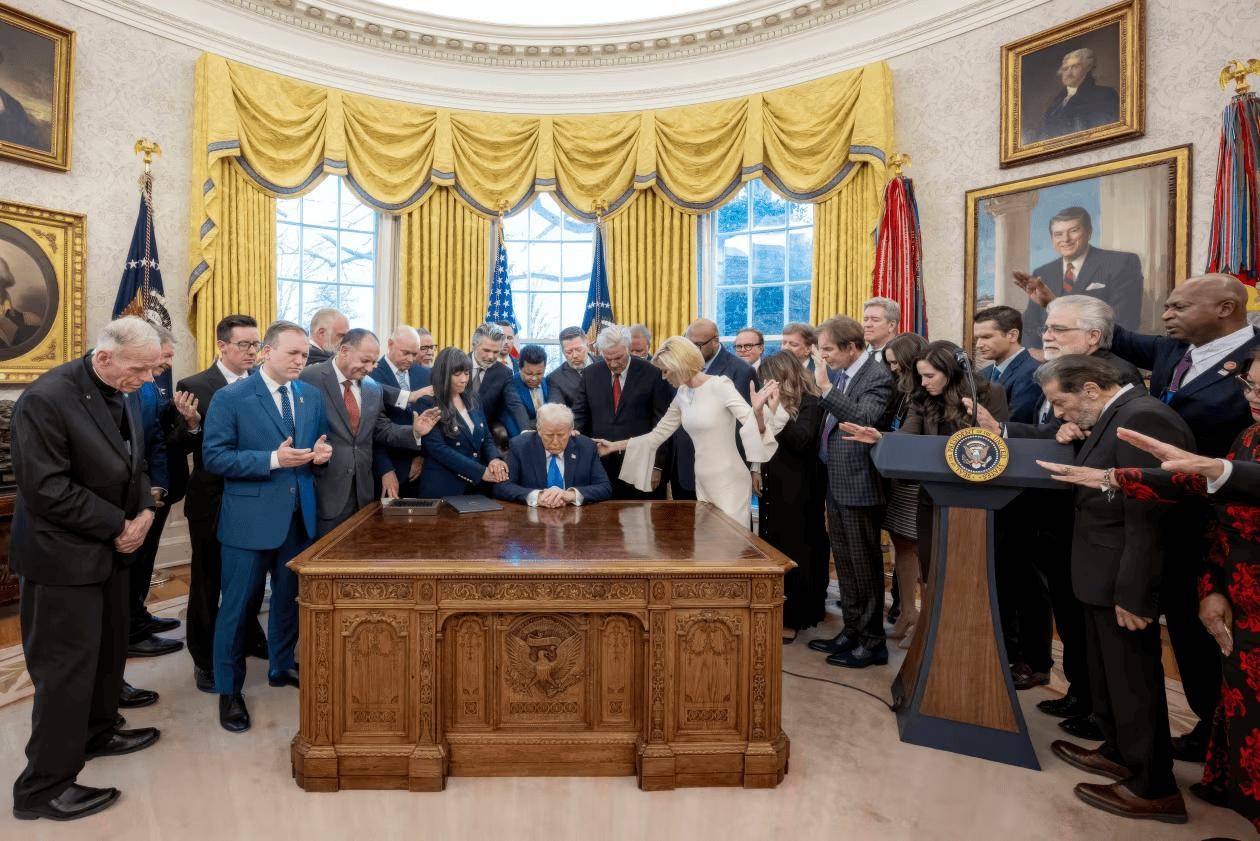 我为什么这么说呢?3月5日,特朗普在白宫椭圆式办公室找牧师搞了一个仪式,他被来自全美的20名牧师团团围住这些牧师把手搭在总统身上,祈祷上帝的恩典与保护降临在他和美军身上。