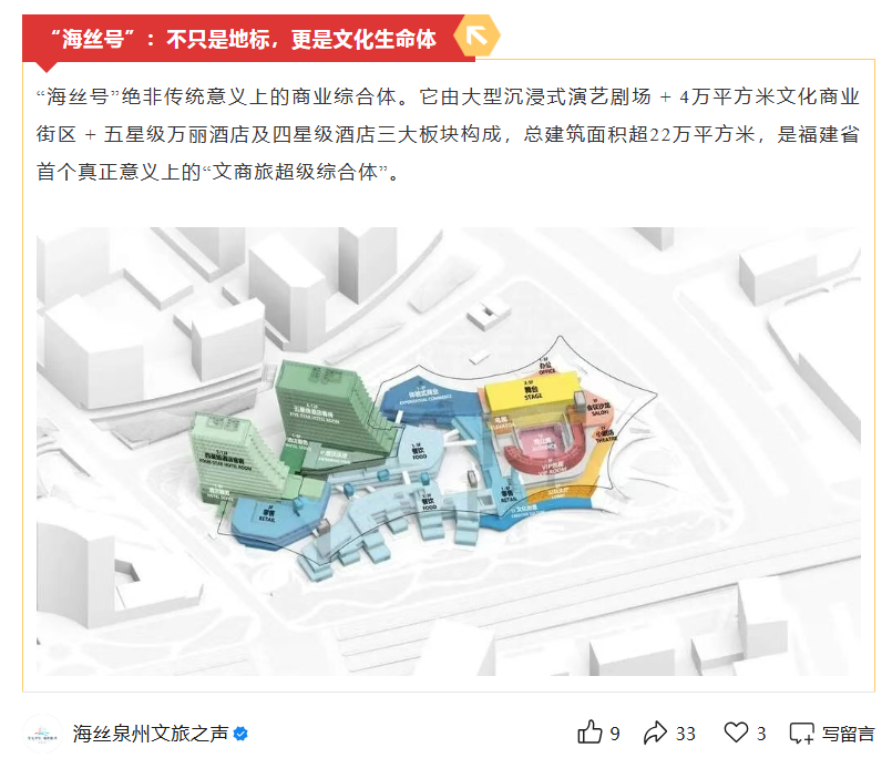 它由大型沉浸式演艺剧场+4万㎡文化商业街区+五星级万丽酒店+四星级酒店构成,总建筑面积超22万㎡,是福建省首个真正意义上的“文商旅超级综合体”。