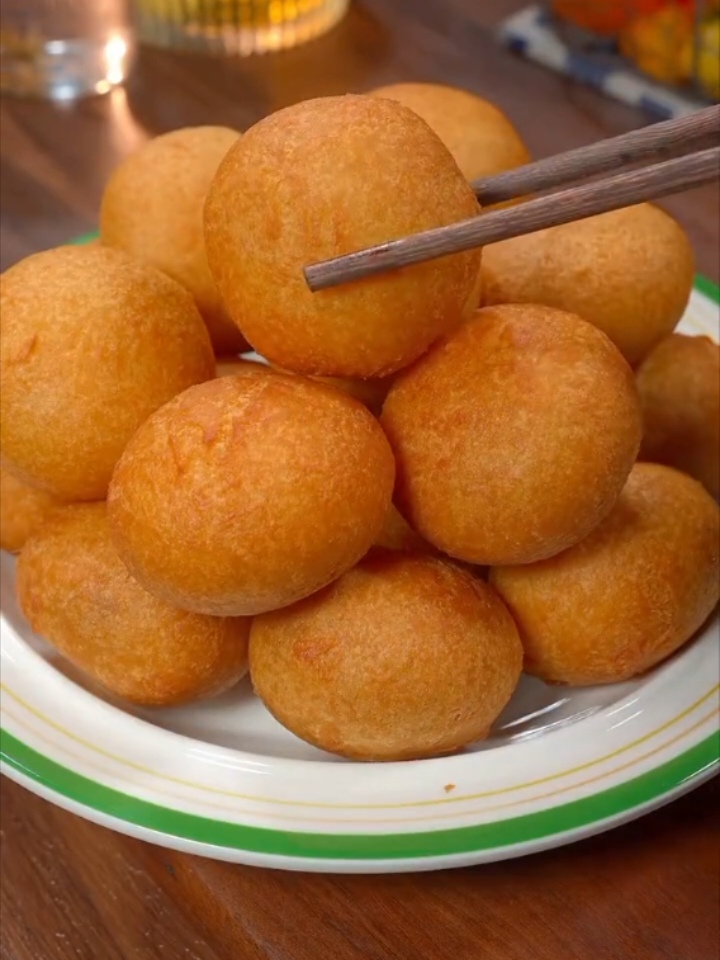 ④起锅烧油,八成油温放入锅中,然后转中火,切记刚入锅的时候不要动它,让它定型之后再适当翻动,等待它浮起来,然后再炸那么一分钟就可以出锅了。